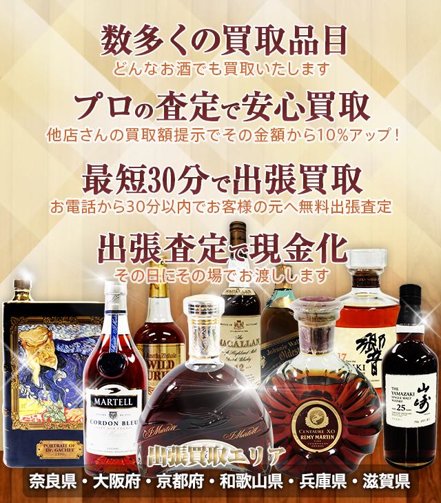 はこちら! ▸出張買取はこちらお酒買取の即日無料出張査定サービスです。お片づけやお引越し、お酒の整理など思い立ったらすぐ売りたいお客様に喜ばれているお酒の買取屋さんの一番ウリになるサービスです。